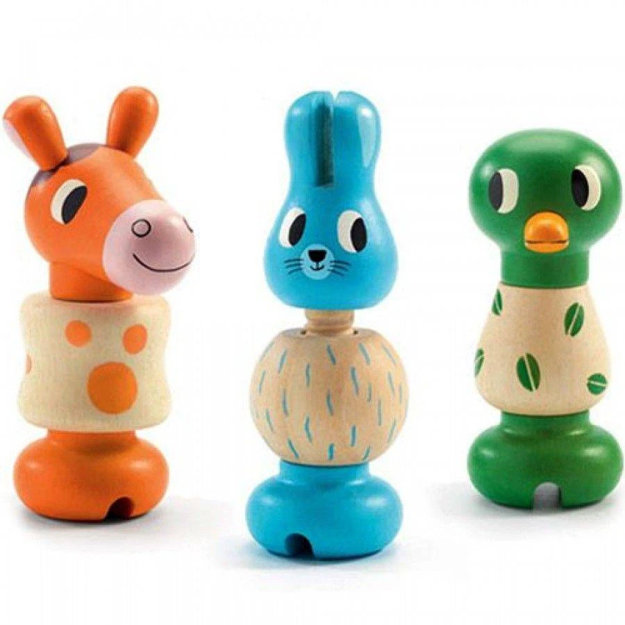 Zet deze 3 verschillende houten diertjes in elkaar door de losse delen in elkaar te schroeven. Maak de uitgebeelde dieren of gebruik je fantasie om nieuwe dieren te verzinnen.