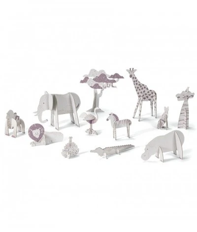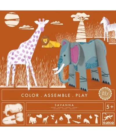 Met deze kleur, bouw & speelset van Djeco bouw je je eigen Savanne. De wilde dieren bestaan uit voorgevormde stevige kartonnen vormpjes welke in elkaar geschoven kunnen worden tot prachtige 3D dieren. Voordat het zover is willen ze graag nog ingekleurd worden. Kleur ze zoals ze horen of maak er eigen fantasie dieren van.