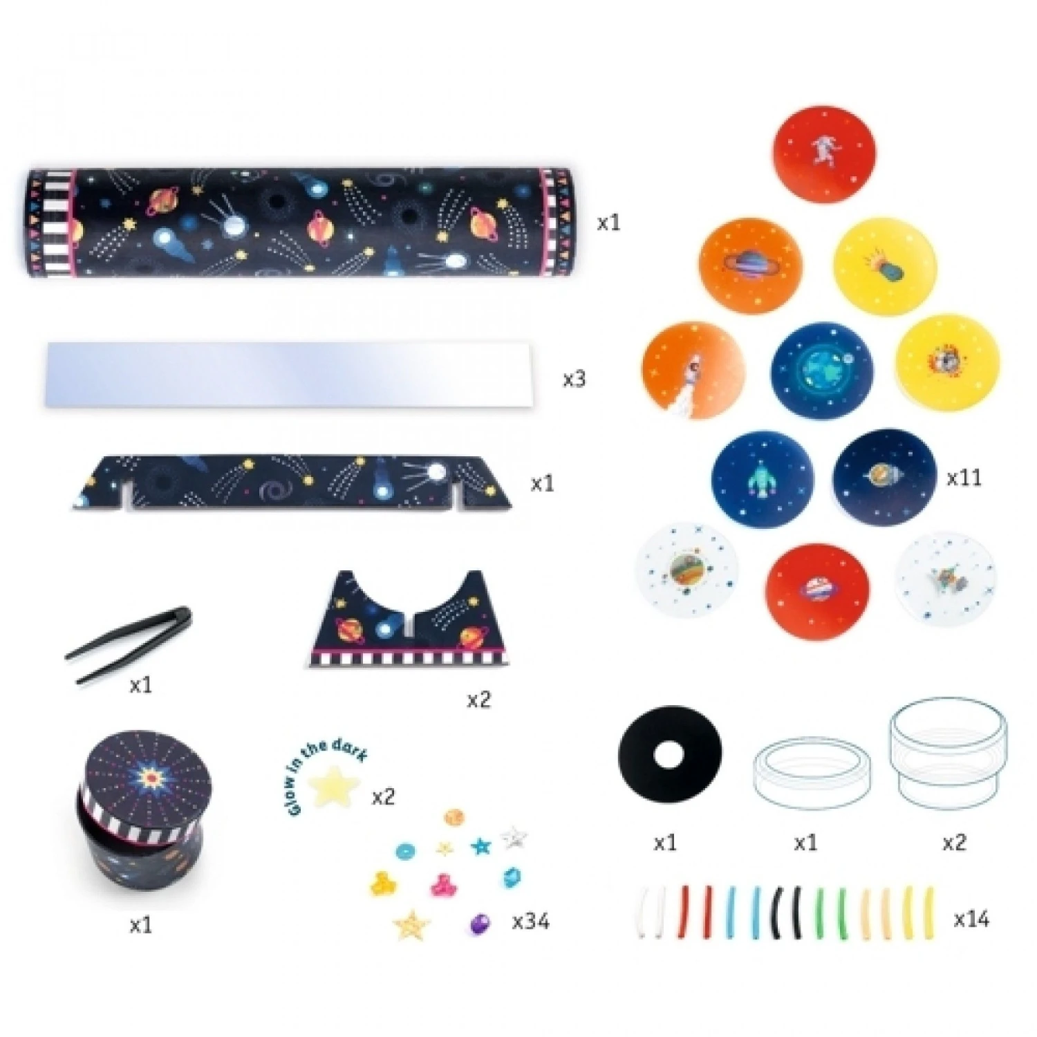 Een caleidoscoop is al uniek maar hem zelf maken is nog veel mooier. Vul de lens met de versieringen en ontdek de sterren en planeten met glow in the dark effecten!