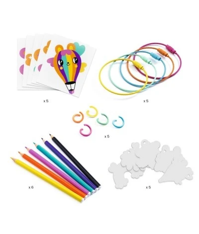 Een magisch knutselsetje van het Franse merk Djeco. Maak 5 schattige sleutelhangers met krimpfolie! Kies een ontwerp en plaats hem over de bijbehorende plastic omtrek. Kleur hem in met de 6 bijgeleverde minipotloden en daarna kan de magie beginnen! Plaats hem in de oven en de stukjes zullen in enkele seconden krimpen en het plastic wordt stijf en dik. Wat overblijft zijn prachtige sleutelhangers die aan een van de gekleurde ringen gehangen kunnen worden.