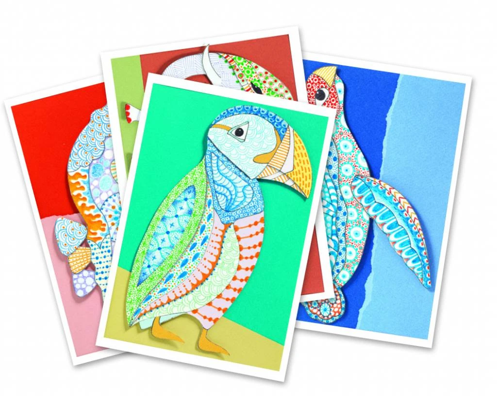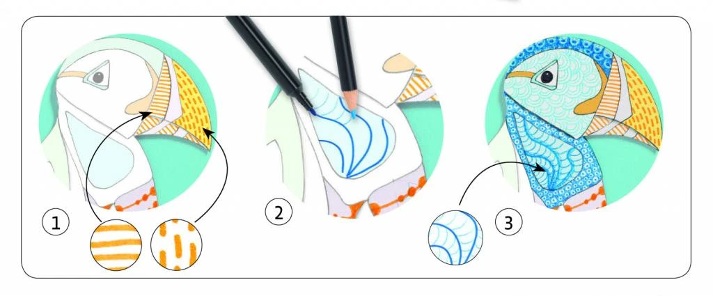 Inhoud: 4 voorbedrukte afbeeldingen van karton (28×21 cm), 5 viltstiften, 4 kleurpotloden, stap-voor-stap instructieboekje.