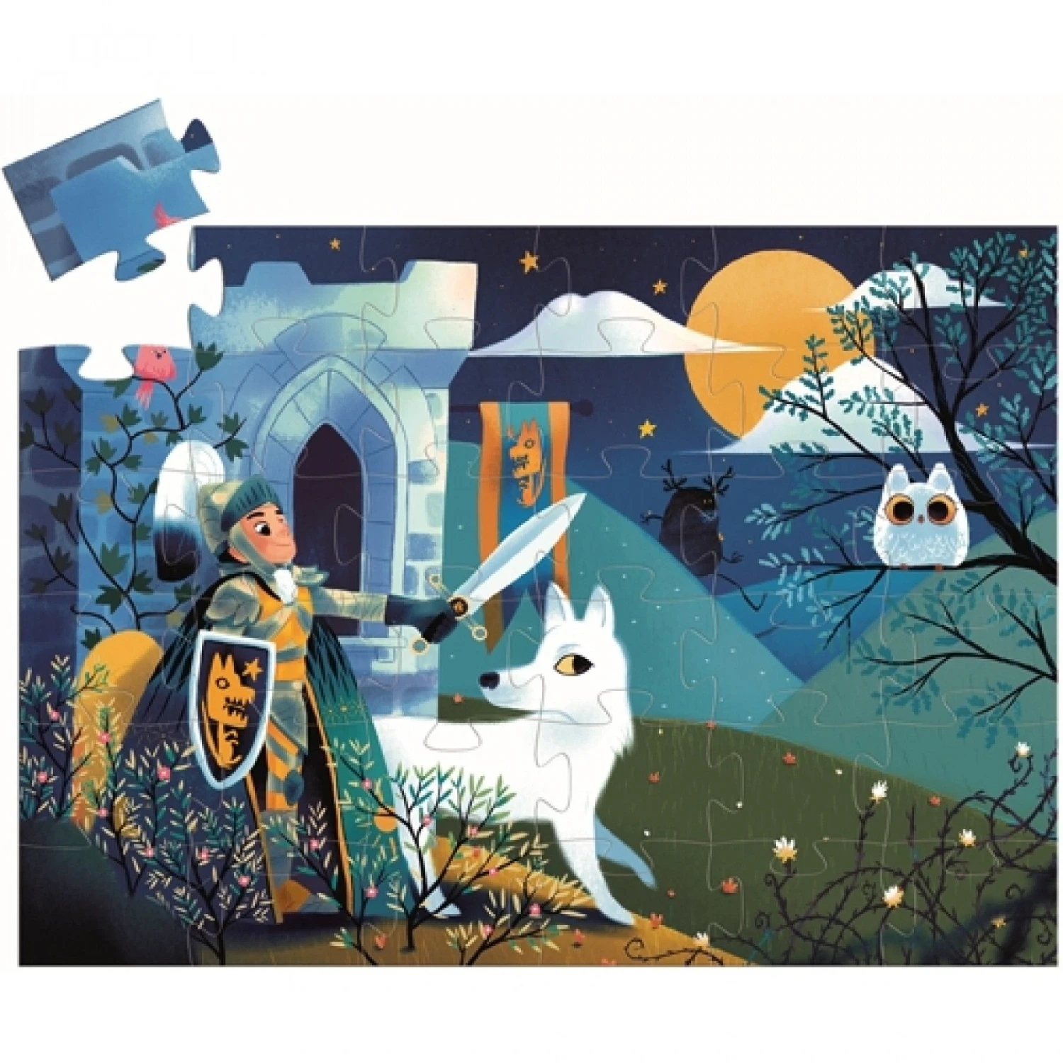 Deze spannende puzzel van Djeco bevat een ridder bij volle maan. Samen met zijn wolf verdedigen ze het kasteel, zie jij waar het monster is?