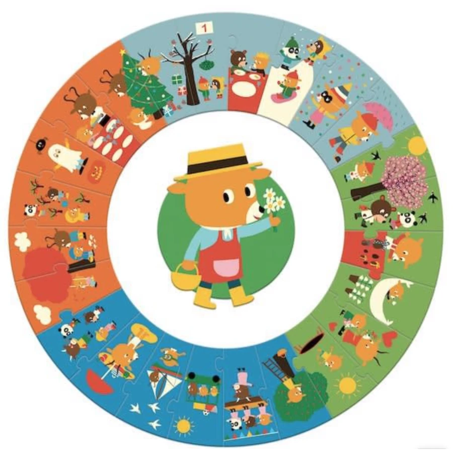 Deze reuzenpuzzel van Djeco beslaat het hele jaar. Elk puzzelstukjes laat een ander beeld van zien. Wanneer je de puzzel in elkaar legt zie je wat de beer allemaal beleeft in een jaar tijd. Zo zien we kerst, winter, carnaval, lente en zelfs moederdag. Wat zie je nog meer terug op de puzzel?