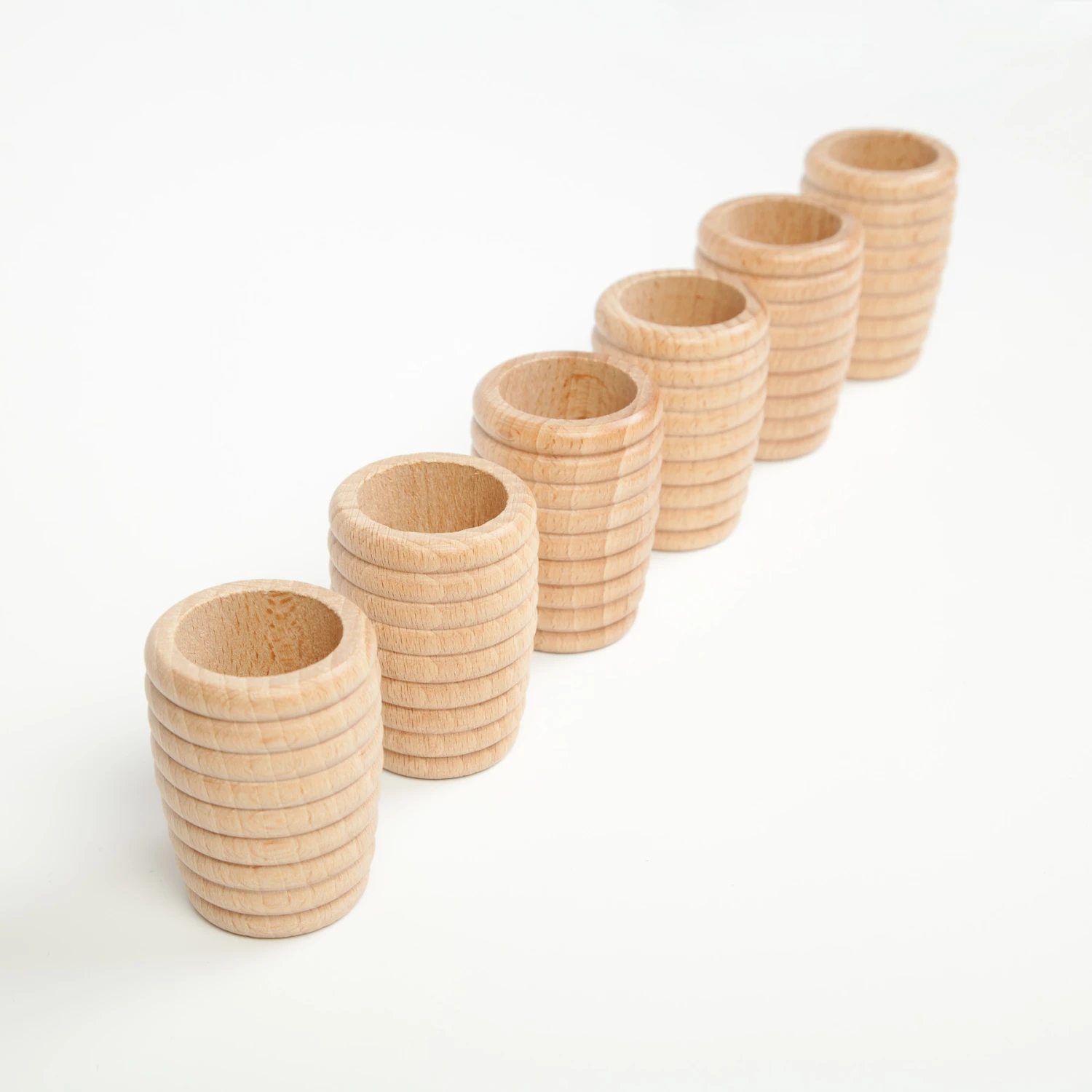Mooie set van 6 naturel gekleurde bijenkorf bekers. Gemaakt van duurzaam beuken- en berkenhout en afgewerkt met plantaardige olie. Hierdoor is het speelgoed van het Spaanse merk Grapat 100% veilig voor kinderen en milieu. Doordat het hout niet gelakt is behoudt het zijn natuurlijke textuur.