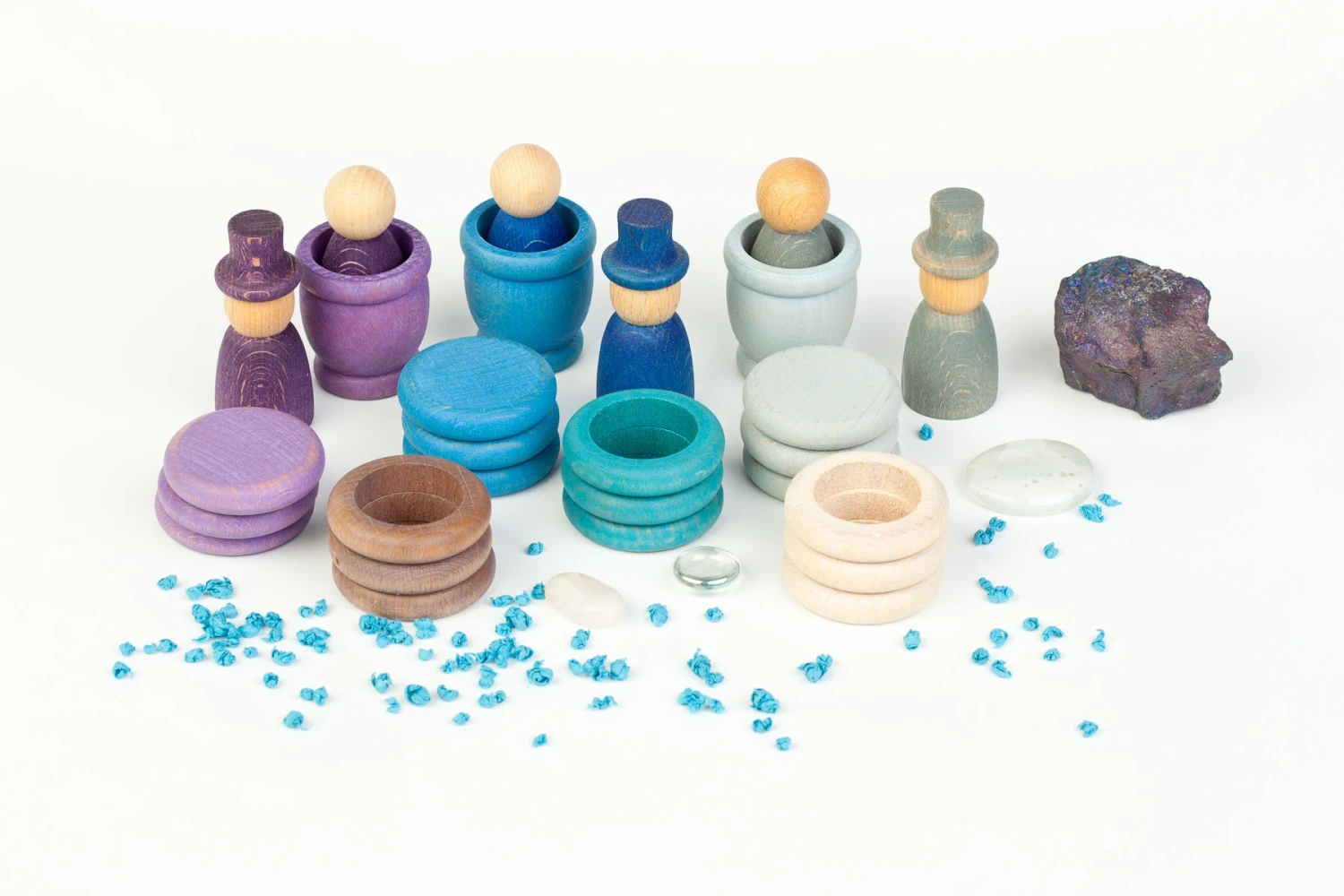 Deze winterse speelset van het Spaanse merk Grapat bestaat uit 6 ‘nins’ poppetjes waarvan 3 met hoge hoed en 3 zonder, 3 bijbehorende bakjes, 9 ringen en 9 schijfjes in in prachtige wintertinten. Ze zijn niet alleen leuk om mee te spelen, ze staan ook prachtig op een winterse seizoentafel.ย