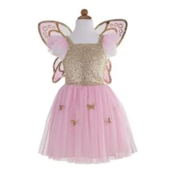 Deze adembenemende gouden vlinderjurk van Great Pretenders is zowel modieus als sprookjesachtig. Je dochter zal stralen als een vlinders op een mooie zomerdag. De jurk heeft een verbazingwekkende gouden pailletten top met tule mouwaccenten. De top loopt over in een rok van zachtroze tule met gouden vlindertjes. In combinatie met de glinsterende goud gestikte glitter vleugels is deze jurk een groot succes.
