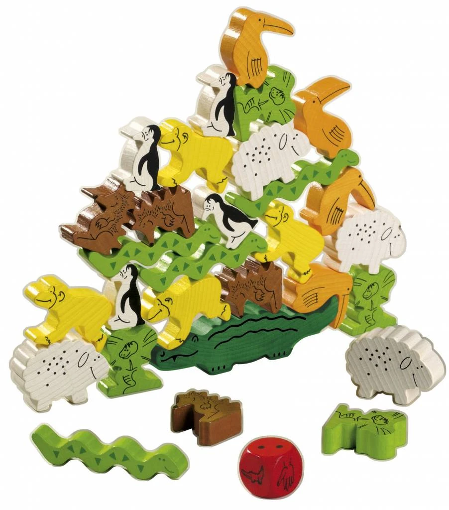 De dieren willen hun kunstje vertonen – de grote piramide! Nu moet er voorzichtig en behendig te werk worden gegaan: wie kan de pinguïn op de krokodil zetten, het schaap op de pinguïn en de slang op het schaap. Ook de miereneter wil bovenop de piramide klimmen en die is al zo duizelingwekkend hoog!