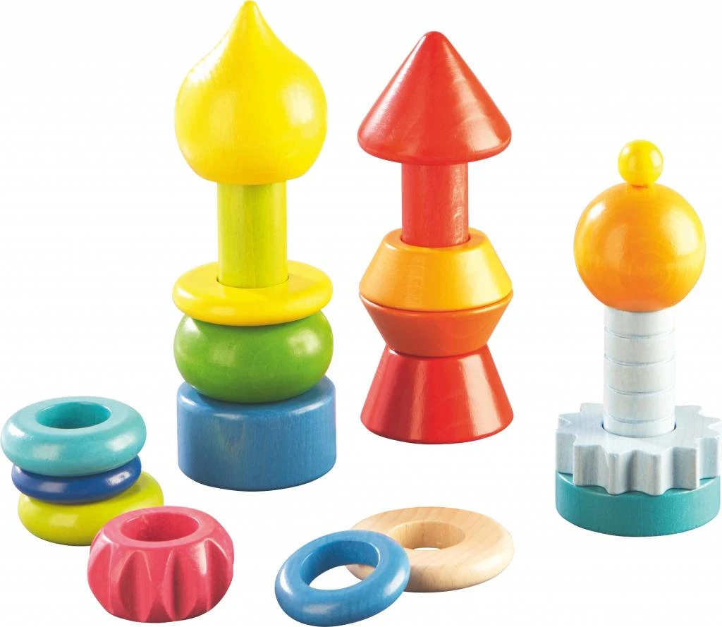 Kleine bouwmeesters kunnen de kleurrijke houten stukken naar believen samenvoegen tot drie torens of er één heel hoge toren mee bouwen. Welke spits moet op de grote toren? Dat is altijd opnieuw heel leuk en bevordert de fijne motoriek.