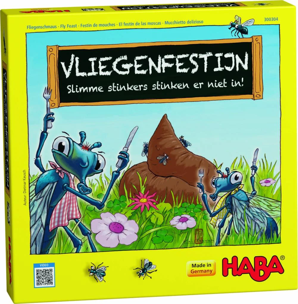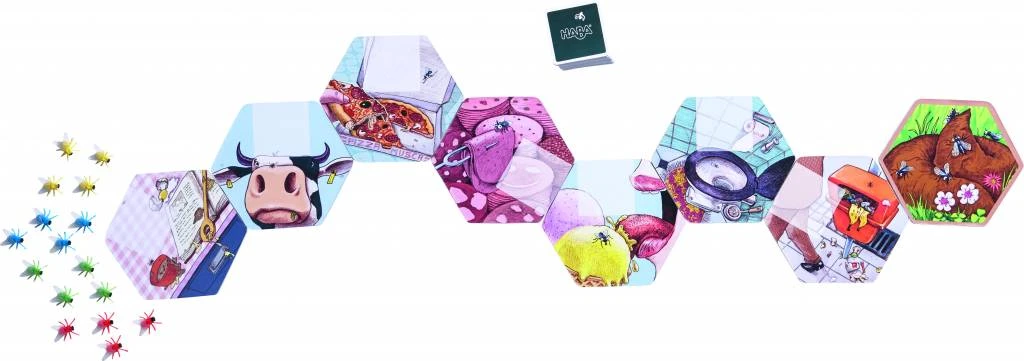 Bzzz, hier vliegen de vieze vliegen rond. Overal liggen verleidelijke landingspunten, maar ze hebben het allemaal gemunt op de ‘geurige’, bruine smulhoop. Alleen als je de kaarten slim neerlegt, kun je met jouw eigen vliegen snel opschieten! Maar pas goed op want niemand is veilig voor de kaart met de vliegenmepper en menige vlieg moet vlak voor de finish weer terug naar af.