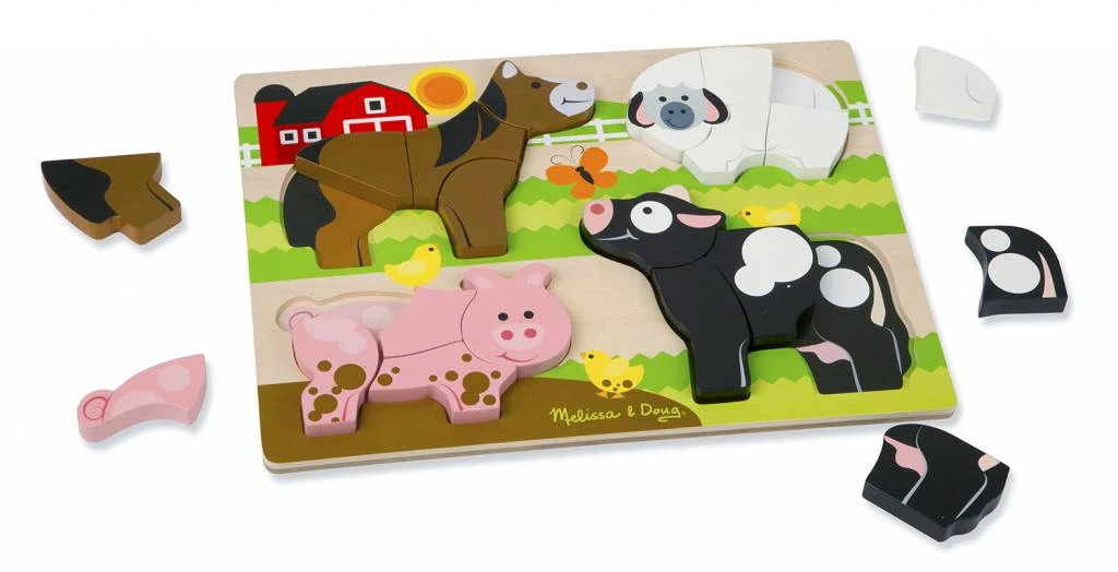 Mooie stevige houten inlegpuzzel met 4 boerderijdieren: een paard, een schaap, een varken en een koe. Elke puzzel bestaat afzonderlijk uit 5 puzzelstukjes.