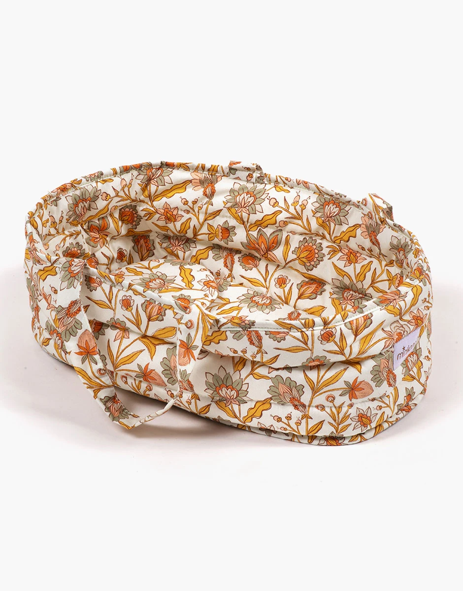 De wieg heeft een mooi bloemenmotief in lente kleuren en is geschikt voor poppen van maximaal 34 cm zoals de Gordi poppen van Paola Reina.