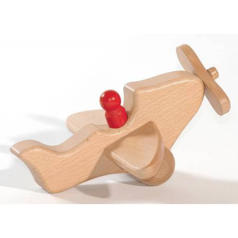 Vliegen we naar Afrika, Amerika of Londen? Alles kan en alles mag met dit mooie, duurzaam houten handgemaakte open vliegtuigje van Ostheimer. Het vliegtuigje wordt bestuurd door een rode houten piloot. De wieltjes kunnen rollen de propeller draait echt!