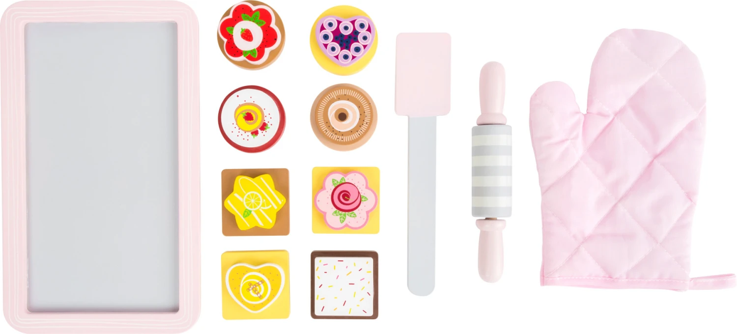 De beweegbare deegroller en houten deegschraper maken deze prachtige houten set compleet.