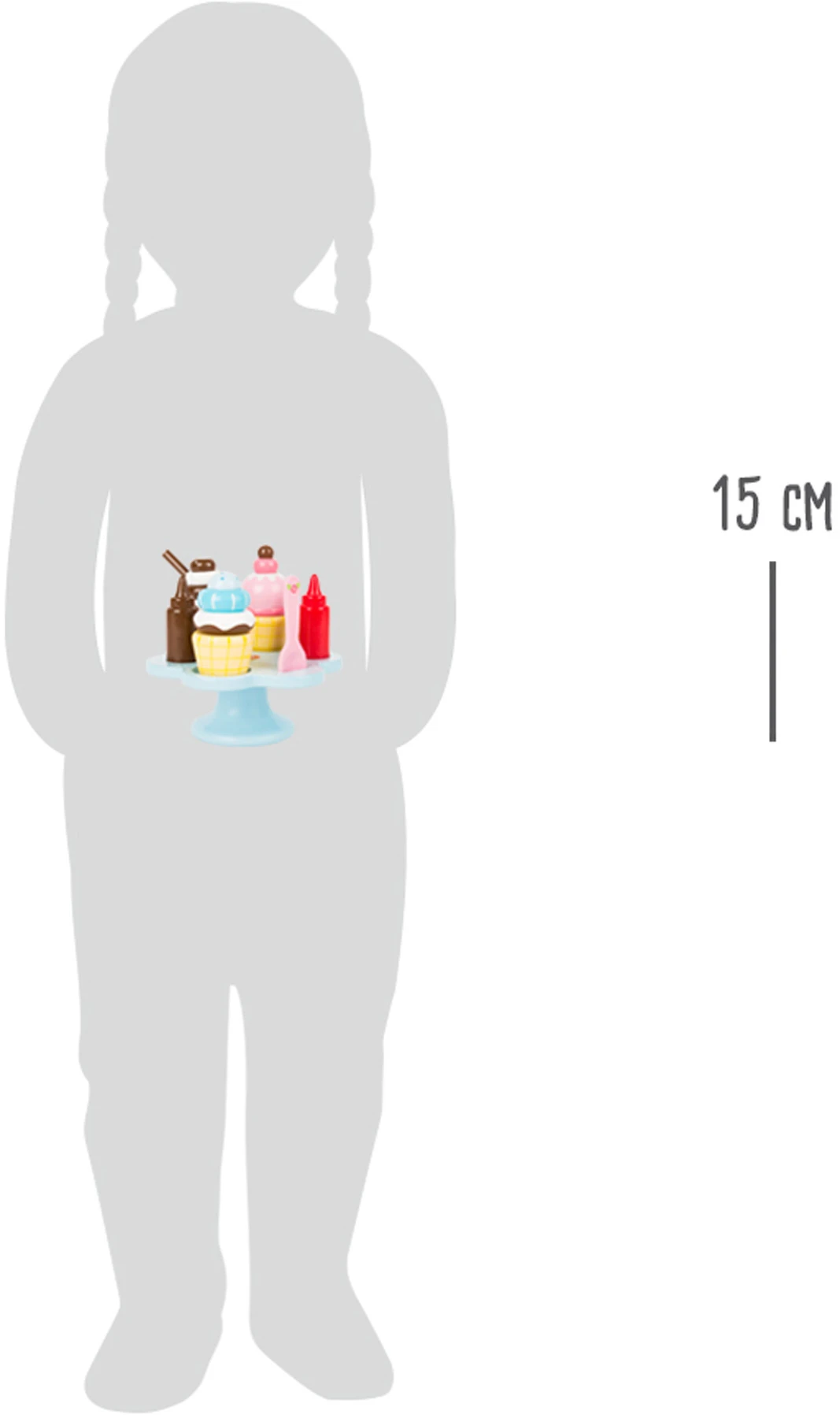 Prachtige houten ijsjesstandaard met verschillende ijsjes en twee soorten saus. Ideaal fantasiespel voor op warme dagen. De ijsjes passen gemakkelijk in de handjes van kinderen en helpen het trainen van motorische vaardigheden.Â