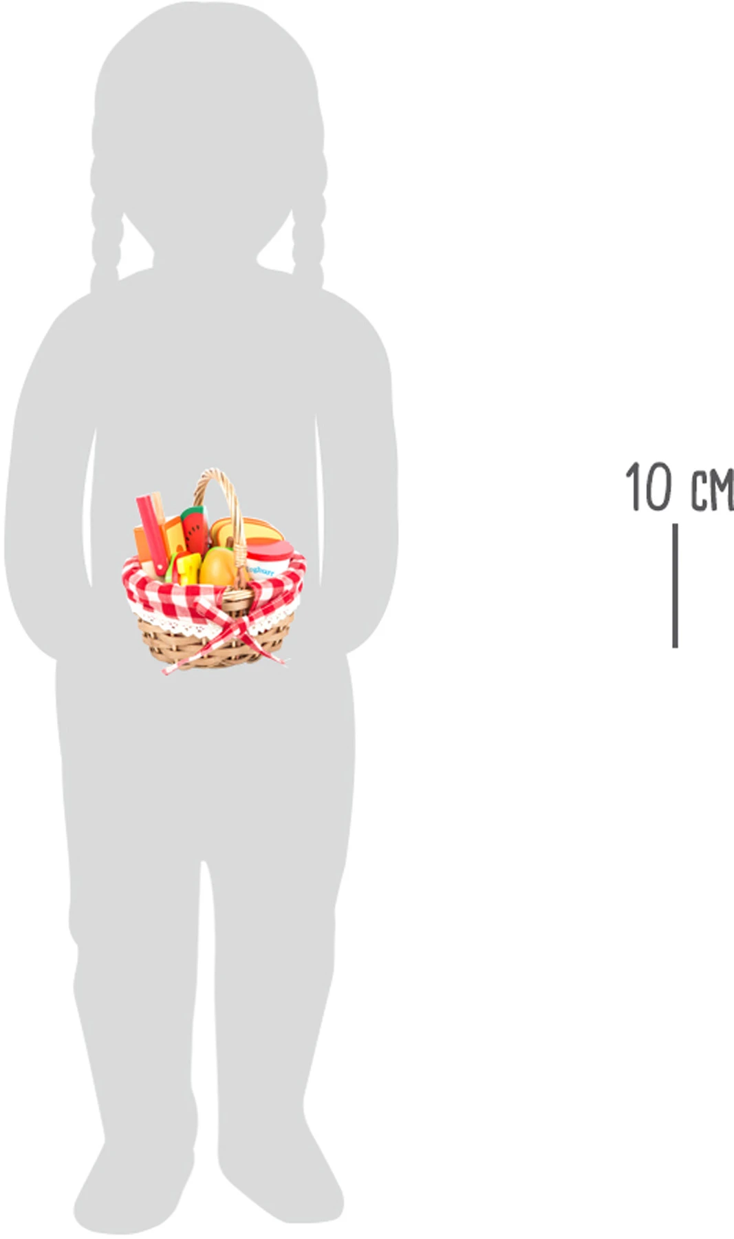 Het is een heerlijke dag en het zonnetje schijnt. Neem al je knuffels en poppen mee naar buiten voor een heerlijke picknick. Deze prachtige geweven picknickmand zit vol met verse houten boodschappen.