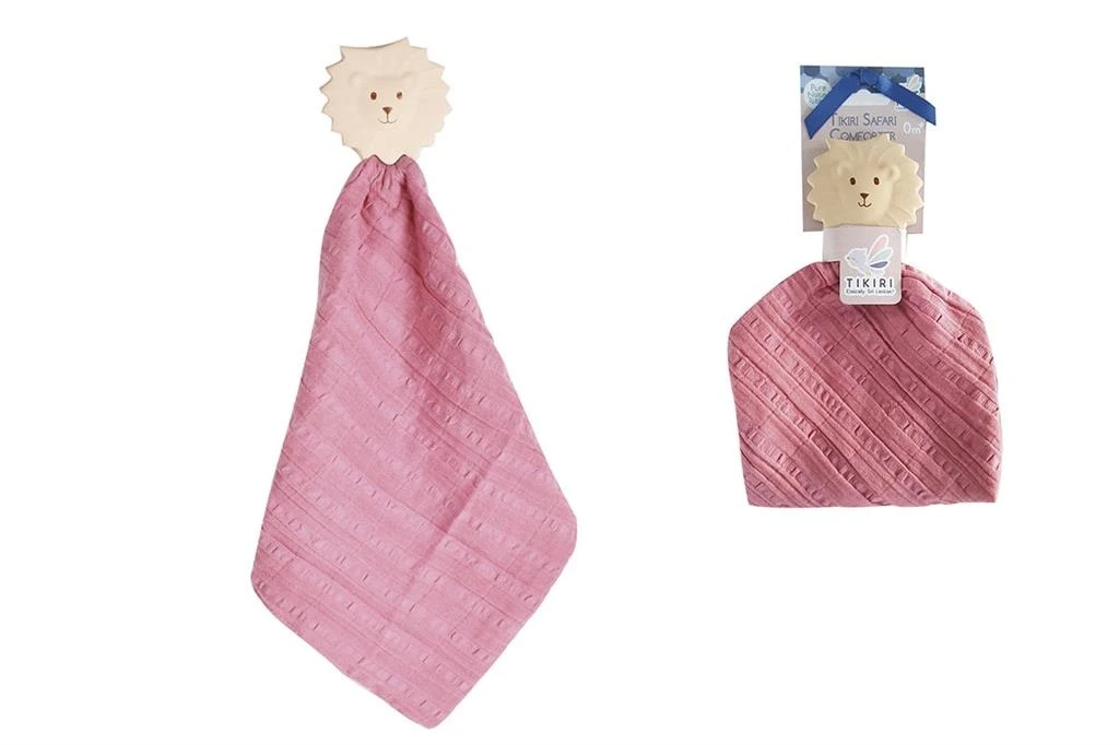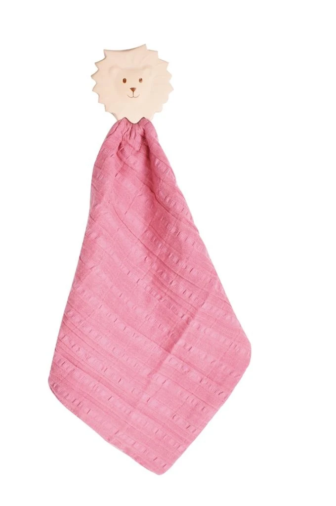 Dit mooie roze knuffeldoekje van Tikiri is heerlijk om mee te knuffelen maar kan tegelijkertijd verlichting geven bij doorkomende tandjes. Het hoofdje van de leeuw is namelijk gemaakt van natuurrubber en heerlijk zacht en veilig om in te bijten. Leuk om te geven bij een babyshower of als kraamcadeau.Â