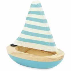 Met dit kleine houten bootje is in bad gaan een feestje! Het bootje heeft een blauwe onderkant en een wit met blauw gestreept zeiltje. Het zeil zit vast aan een kant van de boot, de andere kant wordt opgezet met de bijgeleverde houten mast. Wanneer deze vastgezet wordt zit hij stevig vast.Â